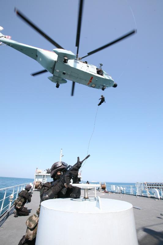 Naval sepcial operations soldiers provide security with rifles as their teammate fast-rope from a Z-8J ship-borne transport helicopter during a simulated maritime anti-terrorist rescue action. A special operations regiment of the PLA navy conducted a year-end training exercise in early December to test the troops' capablities. (81.cn/ Sun Hongtao, Li Youtao)