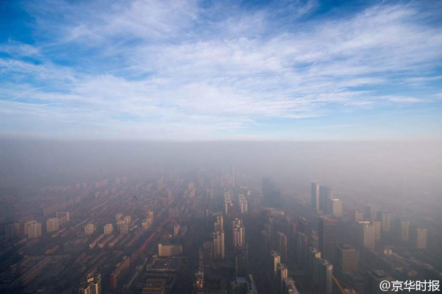 Smog begins to shroud Beijing on Friday, Dec. 16, 2016. The Beijing municipal government has mobilized public transportation and suspended schools for the city's first red alert for air pollution of the year, effective from Friday evening. Density of pollutants in Beijing is expected to increase from Saturday to Monday, followed by a weak cold front on Tuesday that will not disperse the smog, which will persist until Wednesday. [Photo: Beijing Times]