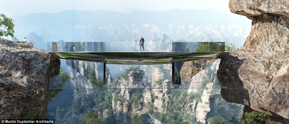 The transparent footbridge, suspended high between two mountain-tops, will cost over £4million to build and has been created by Martin Duplantier Architectes (MDA) and Daqian Landscape Architects, who won a design competition.