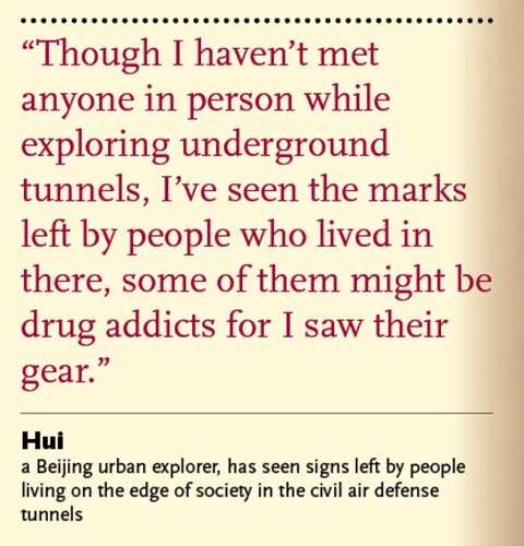 "Though I haven't met anyone in person while exploring underground tunnels, I've seen the marks left by people who lived in there, some of them might be drug addicts for I saw their gear," Hui told the Global Times.
