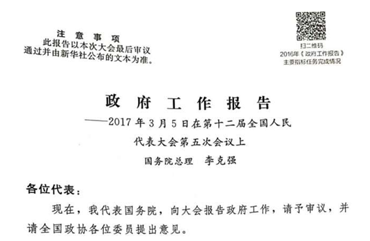 On the handout of the report delivered by Chinese Premier Li Keqiang on the opening ceremony of the 5th session of China's 12th National People's Congress (NPC) on March 5, a QR code is printed on the page, and the readers can access to the full text, H5 pages of the report to have detailed information about the indexes.