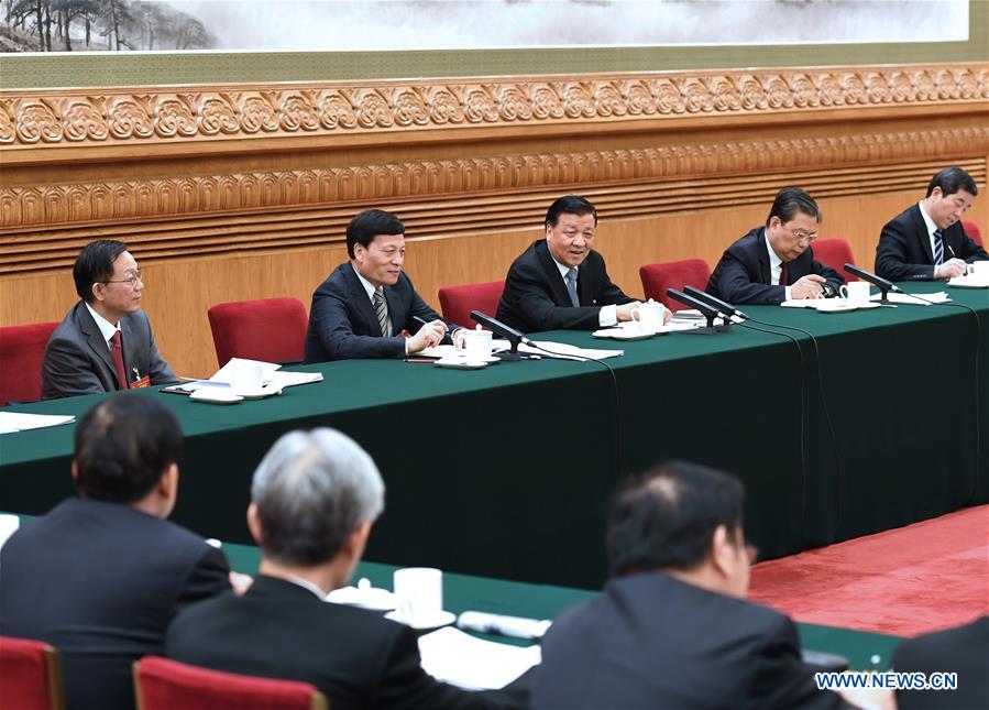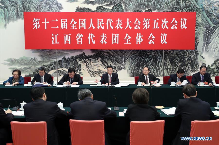 BEIJING, March 12 (Xinhua) -- Senior Chinese leaders on Sunday joined national lawmakers from the provinces of Henan and Jiangxi in discussing socialist core values, industrial upgrading and ecological civilization.