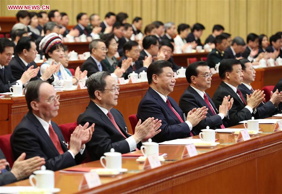 Top Communist Party of China and state leaders Xi Jinping, Li Keqiang, Yu Zhengsheng, Liu Yunshan, Wang Qishan and Zhang Gaoli attend the closing meeting of the fifth session of the 12th National People's Congress at the Great Hall of the People in Beijing, capital of China, March 15, 2017. (Xinhua/Ma Zhancheng)