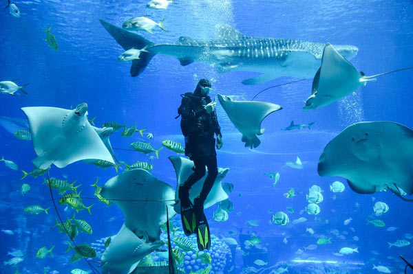 A diver feeds a ray at the Whale Shark Plaza of the Chimelong Ocean Kingdom in Zhuhai city, South China's Guangdong province, March 8, 2017.[Photo/Xinhua]