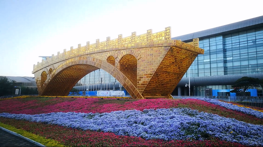 “Golden Bridge on Silk Road,” a flower sculpture created to celebrate the Belt and Road Initiative. Designed by Shu Yong. Photo by Ning Liu/People's Daily Online.