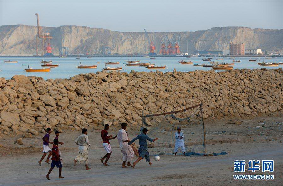 Photo taken on April 10 shows locals playing soccer by Gwadar Port.