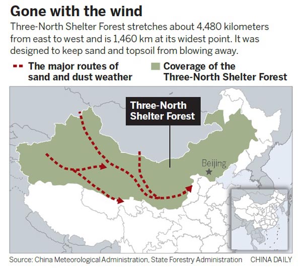 The storm arrived as the State Forestry Administration said the country's expanding shelter forest has worked better in reducing the dust in the originating areas but did little to block the long-distance storm.