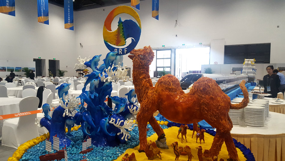 Photo taken on May 12 shows the cafeteria in the media center for the upcoming Belt and Road Forum for International Cooperation being decorated with elements of the ancient Silk Road. The media center offers free meals, fruits, coffee, tea, and desserts for journalists. (People’s Daily Online/Du Mingming)