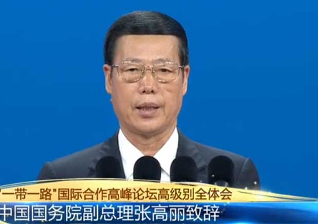 Chinese Vice Premier Zhang Gaoli delivers a speech at the High-level Plenary Meeting of the Belt and Road Forum for International Cooperation on Sunday, May 14, 2017. [Screenshot: China Plus]