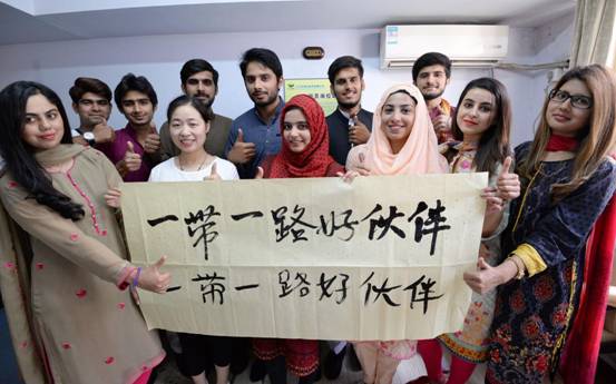 From 2015 to now, a total of 114 students from Pakistan, an important country along the Belt and Road, have come to Hebei Engineering University for studies. To know more and better Chinese culture, they practice in spare time Tai Chi, table tennis, Chinese chess and calligraphy together with their Chinese classmates. In the picture, Chinese and Pakistan students are showing their calligraphy work Good friends along the Belt and Road. (Photo by Shi Ziqiang from People’s Daily)
