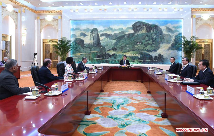 Chinese President Xi Jinping (4th R) meets with the heads of delegations from Brazil, Russia, India and South Africa who are in Beijing to attend the BRICS foreign ministers' meeting in Beijing, capital of China, June 19, 2017. (Xinhua/Rao Aimin)