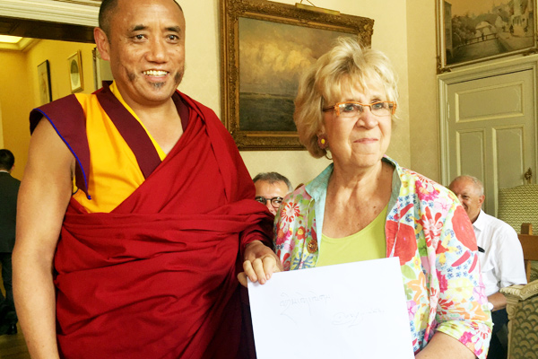 Luosongjiangcun, an executive with the Buddhist Association of the Tibet Autonomous Region of China, wrote "best wishes" in Tibetan for a participant in a seminar on Tibetan culture and history at the City Hall in Huy, Belgium, on Thursday. Fu Jing/China Daily