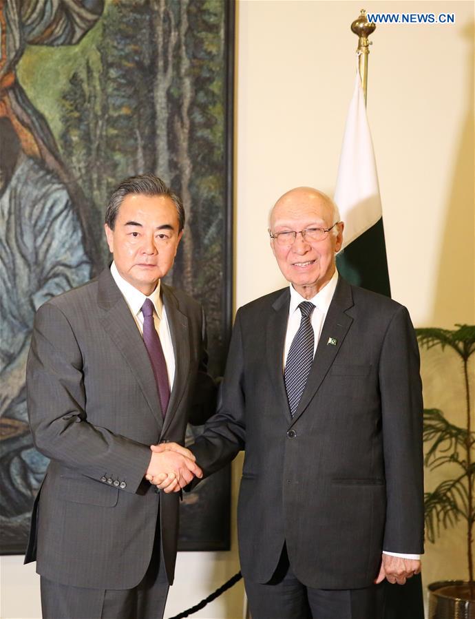 Visiting Chinese Foreign Minister Wang Yi (L) shakes hands with Pakistani top foreign affairs advisor Sartaj Aziz during their meeting in Islamabad, Pakistan, on June 24, 2017. (Xinhua/Liu Tian)