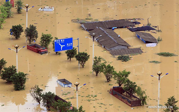The flood is seen in Rongshui Miao Autonomous County, south China's Guangxi Zhuang Autonomous Region, July 2, 2017. Consecutive heavy rains raised the water level in Rongjiang River, which resulted in flood in the county.