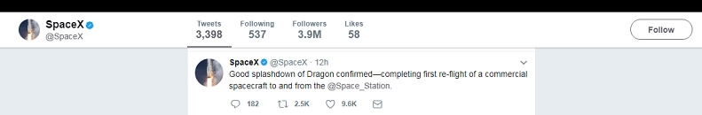 The California-based company confirmed Dragon's successful landing via Twitter: "Good splashdown of Dragon confirmed – completing first re-flight of a commercial spacecraft to and from the @Space_Station."