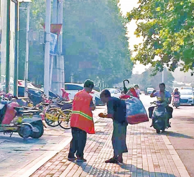 A touching scene in Zhengzhou moved many netizens on Monday: an old, blind beggar kneeling to thank a sanitation worker who gave him her breakfast.