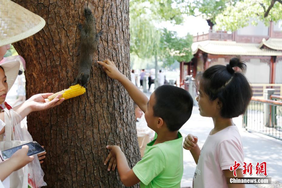 Because of the improvement of environment and people’s friendly treatment, wild squirrels are no longer afraid when people try to feed them, presenting an image of harmony between man and nature at the West Lake in Hangzhou, Zhejiang Province. (Photo/ Chinanews.com)
