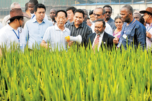 Yuan Longping hosts agricultural officials from Asia and Africa to his hybrid rice research and testing field in Hunan province. (File Photo)