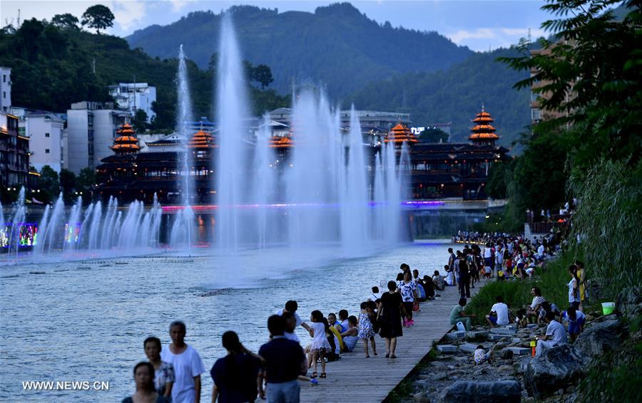 People enjoy coolness and the beautiful night view illuminated with colored lights along the Fengyu bridge at Xuanen County in Enshi Tujia and Miao Autonomous Prefecture, central China's Hubei Province, July 23, 2017. (Xinhua/Song Wen)