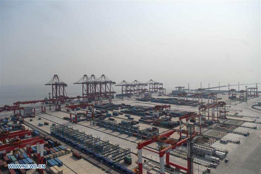 Photo taken on July 25, 2017 shows the fourth phase of the Yangshan deep water port in Shanghai, east China. China's biggest automated cargo wharf, the fourth phase of the Yangshan deep water port, will start trial operation by the end of 2017. Upon completion of the project, the port will have seven deep-water berths and is expected to handle an annual throughput of four million TEUs (twenty-foot equivalent unit). (Xinhua/Shen Hong)