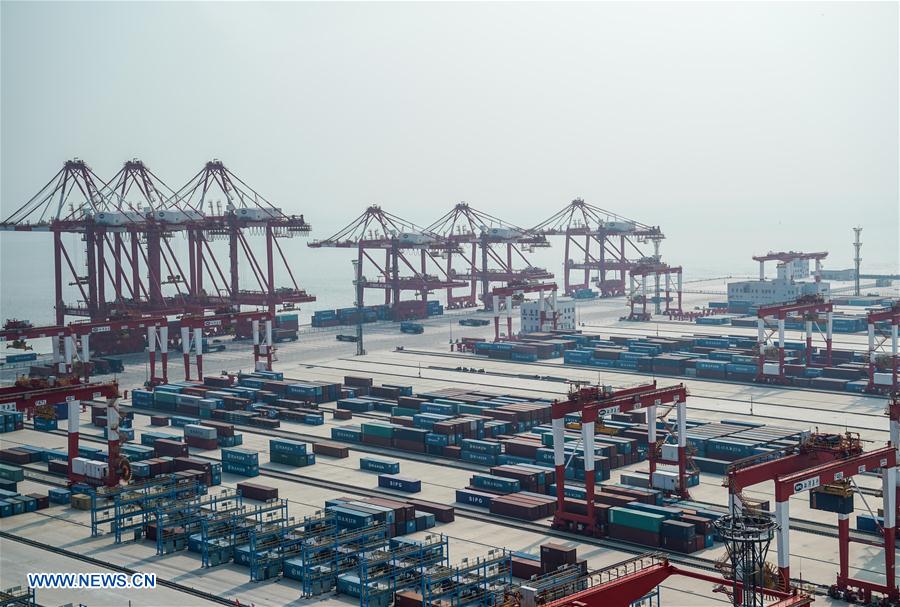 Photo taken on July 25, 2017 shows the wharf of the fourth phase of the Yangshan deep water port in Shanghai, east China. China's biggest automated cargo wharf, the fourth phase of the Yangshan deep water port, will start trial operation by the end of 2017. Upon completion of the project, the port will have seven deep-water berths and is expected to handle an annual throughput of four million TEUs (twenty-foot equivalent unit). (Xinhua/Shen Hong)