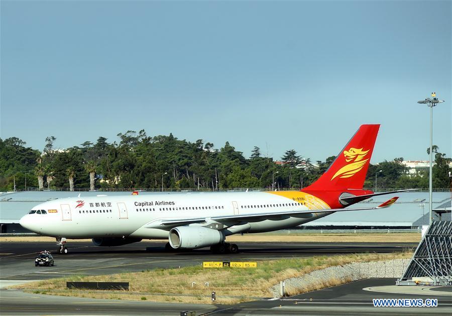 The first direct flight from China's Hangzhou to Portuguese capital Lisbon via Beijing, capital of China, lands at the Humberto Delgado Airport, Lisbon on July 26, 2017. An air route between Hangzhou, Beijing and Lisbon was inaugurated Tuesday, the first direct flight connecting the capitals of China and Portugal. (Xinhua/Zhang Liyun)