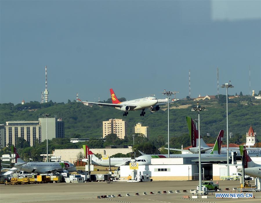 The first direct flight from China's Hangzhou to Portuguese capital Lisbon via Beijing, capital of China, is landing at the Humberto Delgado Airport, Lisbon on July 26, 2017. An air route between Hangzhou, Beijing and Lisbon was inaugurated Tuesday, the first direct flight connecting the capitals of China and Portugal. (Xinhua/Zhang Liyun)