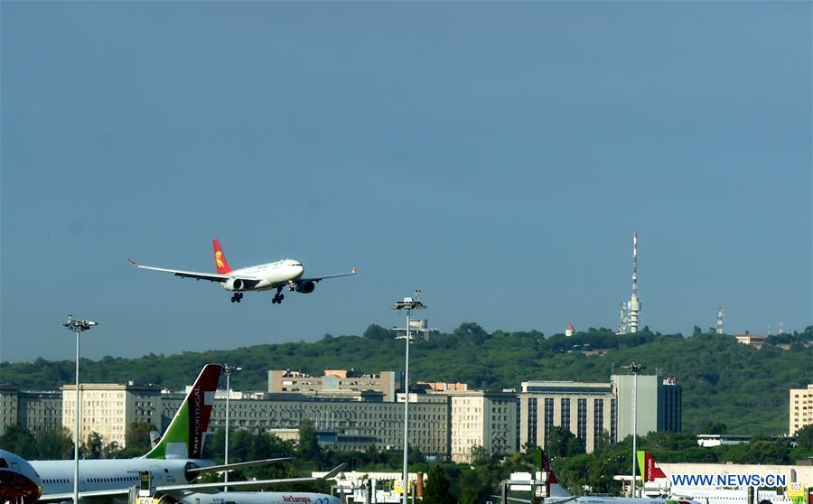 The first direct flight from China's Hangzhou to Portuguese capital Lisbon via Beijing, capital of China, is landing at the Humberto Delgado Airport, Lisbon on July 26, 2017. An air route between Hangzhou, Beijing and Lisbon was inaugurated Tuesday, the first direct flight connecting the capitals of China and Portugal. (Xinhua/Zhang Liyun)