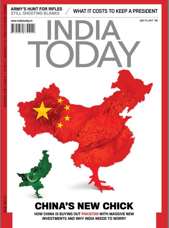 India Today, one of India’s most circulated English-language magazines, unveiled the cover of its latest issue on July 21, in which it depicted a red chicken representing China, whose tail and a leg are carved away. A green chick in the shape of Pakistan is also illustrated and dubbed “China’s new chick.” The latest issue also published an article criticizing China for building the China-Pakistan Economic Corridor, adding that the move is meant for a “takeover of Pakistan by China.”