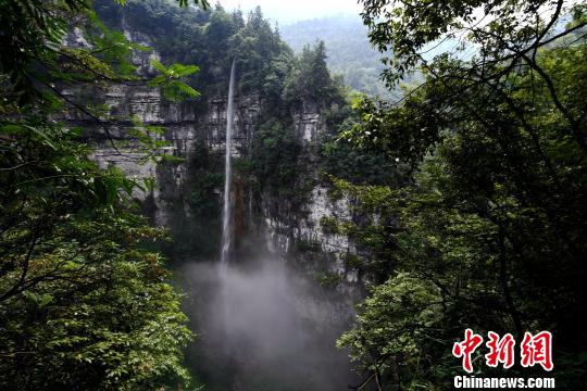 A 183-meter waterfall is found at Shijiaqian Cenote in Dudu Town, Fengdu County, Chongqing. (Photo/Chinanews.com)