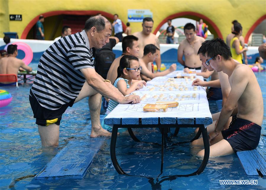 People play Chinese chess in a swimming pool to cool off at a waterpark in Chongqing, southwest China, Aug. 2, 2017. A red alert for high temperatures was issued by Chongqing meteorological observatory on Wednesday, as some areas saw temperatures surpass 40 degrees Celsius. (Xinhua/Wang Quanchao)