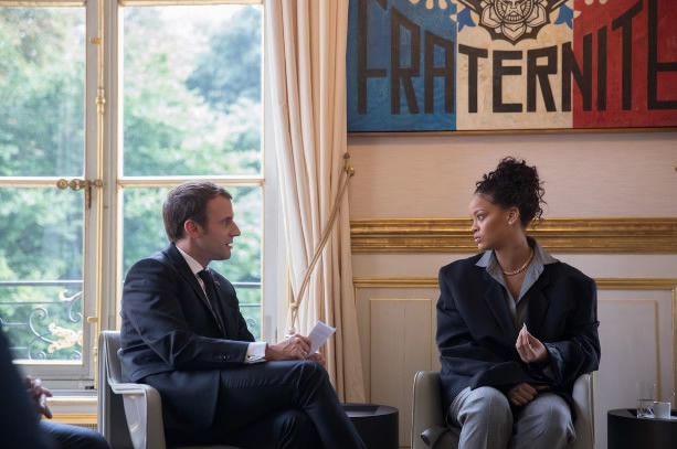French President Emmanuel Macron meets with Rihanna on children's educational issue/ screengrab from Macron's Twitter account