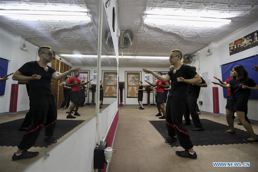 Alex Richter gives lessons to his high-level students at his Kung Fu school "City Wing Tsun" in New York, the United States, July 12, 2017. Hidden in the midtown of bustling New York City is "City Wing Tsun". This is Alex Richter's Kung Fu school which features, as the name suggests, Wing Tsun, a Hong-Kong style martial art. As a native-born American kid, Richter was hugely influenced by the martial art films star Bruce Lee. His love towards Kung Fu, especially Wing Tsun, which Bruce Lee learned as a teenager, has been with him ever since. Richter started to learn Wing Tsun at the age of 15 in Seattle area in the United States. At age 19, Richter shipped himself to Germany for Wing Tsun training for several years. In 2002, he rented a small dance studio and started his career as a martial art instructor in New York. At the beginning, he had only 15 students. Step by step, he now has over 400 students. "Kung Fu is part of my life now, it influences the way you look at everything," he said. "It is not only about fist fighting." Richter has also improved his training curriculum to maximize the benefits for all students. He builds up records for all his students. Richter is also documenting the old stories of martial artists, hoping he can get them published in the future. (Xinhua/Wang Ying)