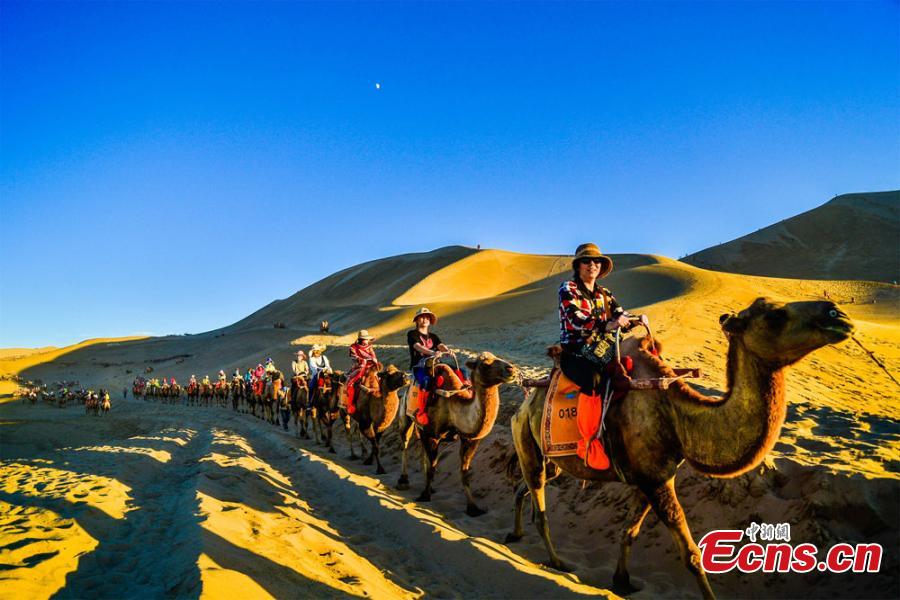 Tourists visit the Crescent Spring and Singing-Sand Dunes scenic spot in Dunhuang City, Northwest China’s Gansu Province. More than 25,000 people visit the tourist attraction each day during the peak summer period. (Photo: China News Service/Wang Binyin)