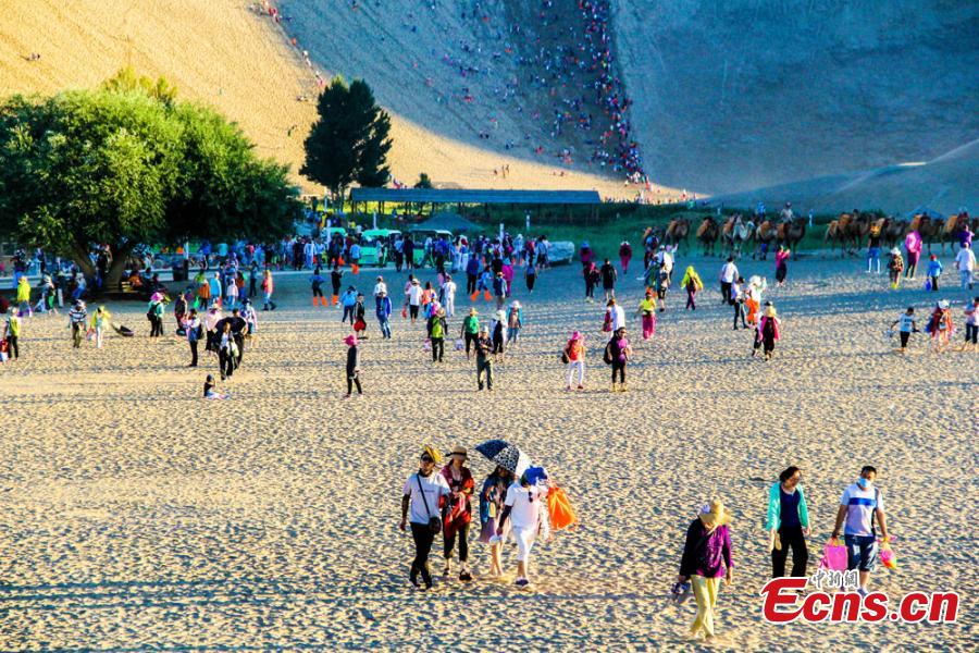 Tourists visit the Crescent Spring and Singing-Sand Dunes scenic spot in Dunhuang City, Northwest China’s Gansu Province. More than 25,000 people visit the tourist attraction each day during the peak summer period. (Photo: China News Service/Wang Binyin)