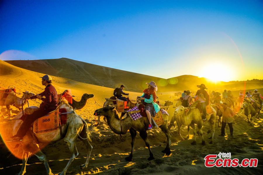 Tourists visit the Crescent Spring and Singing-Sand Dunes scenic spot in Dunhuang City, Northwest China’s Gansu Province. More than 25,000 people visit the tourist attraction each day during the peak summer period. (Photo: China News Service/Wang Binyin)