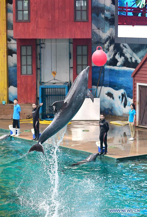 A dolphin performs under the instruction of a trainer at Qujiang Polar Ocean Park in Xi'an, capital of northwest China's Shaanxi Province, Aug. 2, 2017. (Xinhua/Shao Rui)
