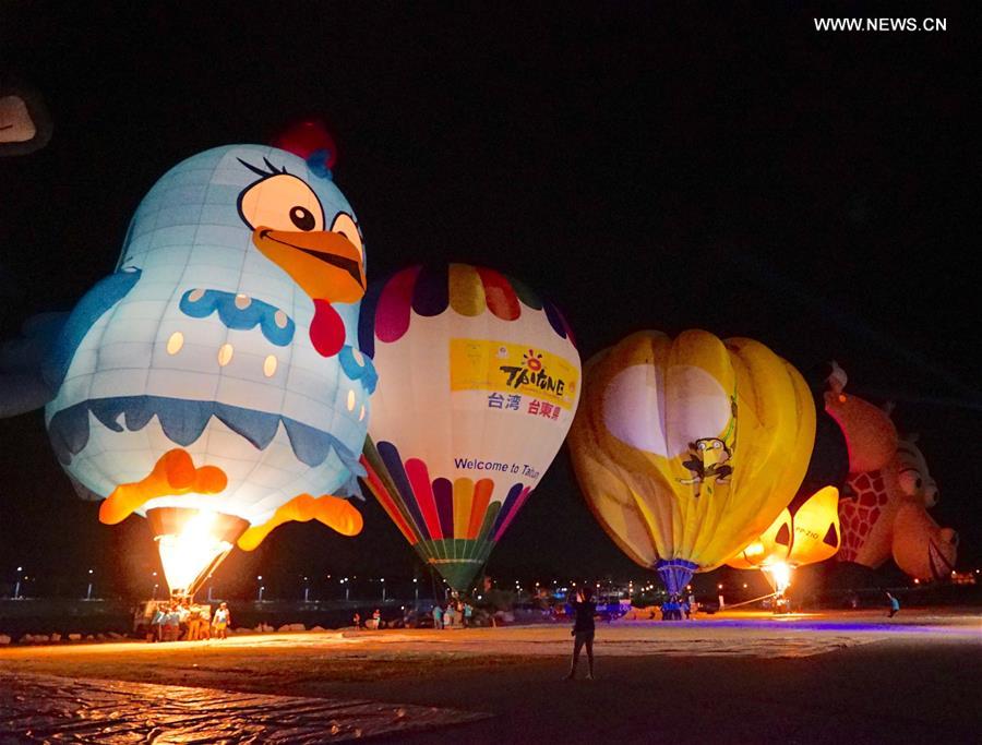 Hot air balloons of various shapes are seen during a balloon festival in Taitung, southeast China's Taiwan, Aug. 2, 2017. (Xinhua/Zhou Mi)