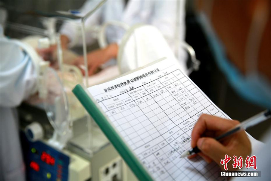 A medical worker checks the health of the newborn pair.[Photo/Chinanews.com]
