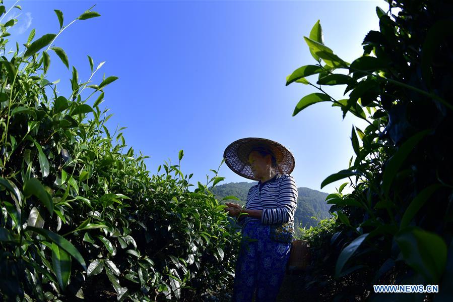 A farmer picks tea leaves in the tea garden of Xuanen County, Enshi Tujia Autonomous Prefecture, central China's Hubei Province, Aug. 7, 2017. Monday marks the Beginning of Autumn, one of the 24 Solar Terms. The local farmers begin their new session of seasonal tea production, the major source of income. (Xinhua/Song Wen)