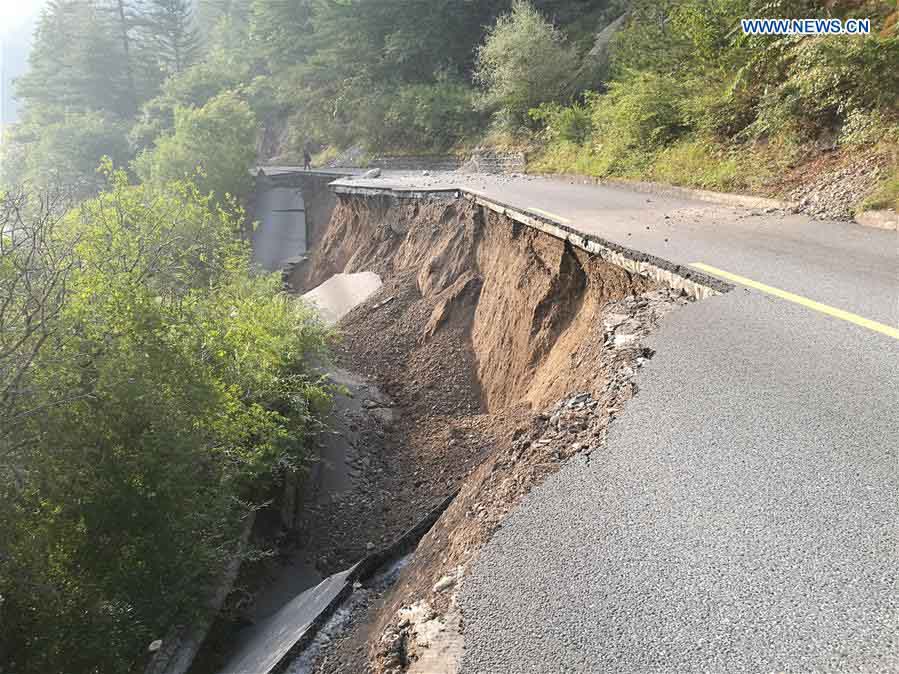 Photo taken on Aug. 9, 2017 shows the road damaged by earthquake in the scenic spot of Wuhua Lake in Jiuzhaigou County, southwest China's Sichuan Province. After a 7.0-magnitude earthquake jolted Jiuzhaigou County, staff members of the scenic spot started searching for the missing, paying close attention to the quake. (Xinhua/Sang Ji)