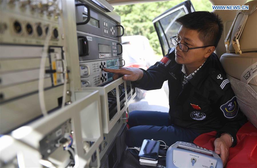 A staff member of China Telecom checks emergency communication devices in Jiuzhaigou County, southwest China's Sichuan Province, Aug. 9, 2017. A 7.0-magnitude earthquake jolted Jiuzhaigou on Tuesday. (Xinhua/Liu Kun)