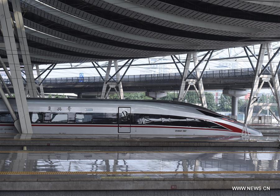 A Fuxing train is seen at the Beijing South Railway Station in Beijing, capital of China, Aug. 21, 2017. China's new-generation bullet trains, the Fuxing, was put into operation on the Beijing-Tianjin Intercity Railway Aug. 21. (Xinhua/Luo Xiaoguang)