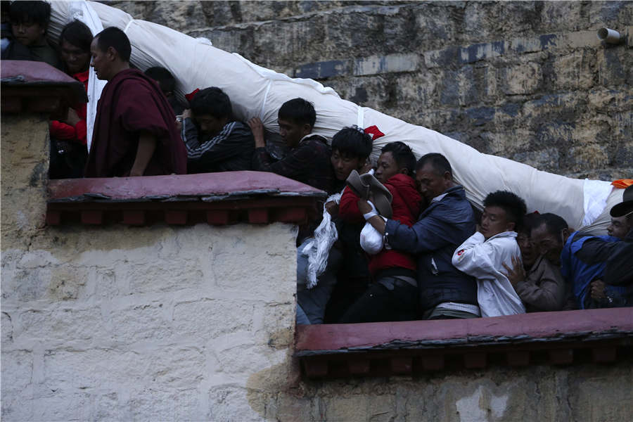 Buddhists and believers carry a large thangka painting of the Buddha for exhibition at Drepung Monastery in Lhasa, capital of Southwest China's Tibet autonomous region, Aug 21, 2017. [Photo by Feng Yongbin/Asianewsphoto]