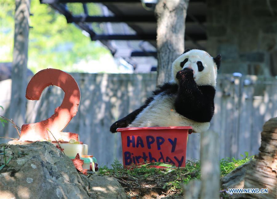 Giant panda Beibei is seen beside its birthday cake during a celebration at Smithsonian's National Zoo in Washington D.C., the United States, Aug. 22, 2017. The zoo on Tuesday held a celebration for giant panda Beibei's two-year-old birthday, which attracted lots of visitors. (Xinhua/Yang Chenglin)