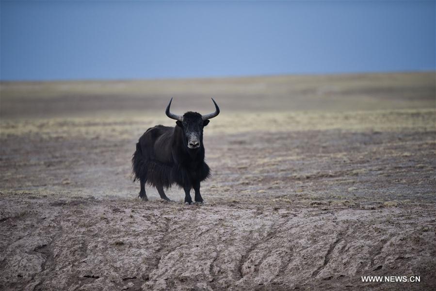A yak is seen in Hoh Xil in Yushu Tibetan Autonomous Prefecture, northwest China's Qinghai Province, Dec. 1, 2016. Hol Xil has an average altitude of over 4,600 meters, making it an ideal habitat for Tibetan antelopes, kiangs and other animals. It was enlisted as one of the UNESCO's World Natural Heritages in July 2017. (Xinhua/Wu Gang)