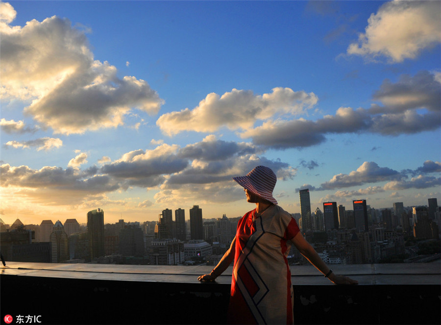A tourist in front of the skyline of Puxi with high-rise buildings and Huangpu River on a clear day in Shanghai, August 22, 2017. [Photo/IC]