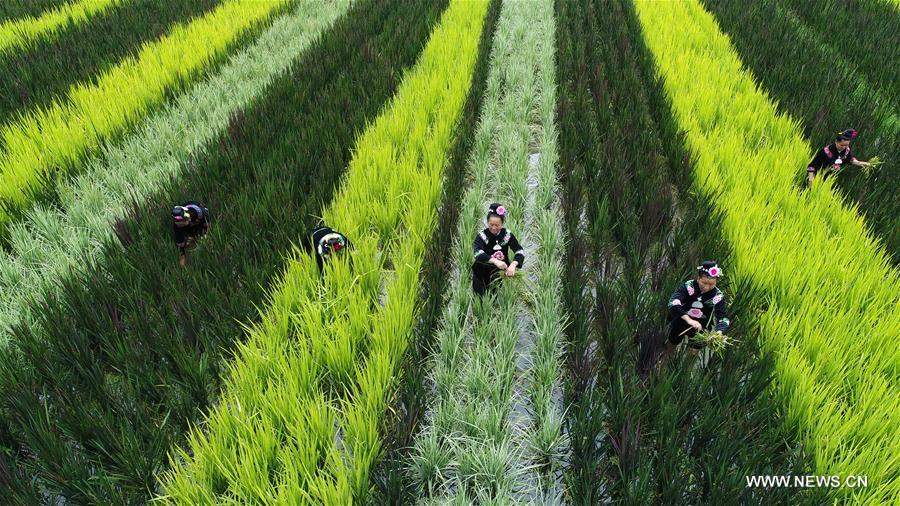 Farmers of Miao ethnic group work in paddy-fields in Yangfang Village of Taijiang County, southwest China's Guizhou Province, Aug. 24, 2017. (Xinhua/Yang Ying)