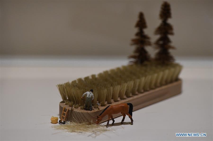 Photo take on Aug. 24, 2017 shows a miniature artwork displayed in Taipei, south China's Taiwan. "Tanaka Tatsuya's Fantastic World", a childlike exhibition held in Taipei with the imaginative mini world of handmade dolls and daily items, is created by Tanaka Tatsuya, a Japanese artist. The exhibition has attracted many people and will last till Sept. 10. (Xinhua/Zhou Mi)