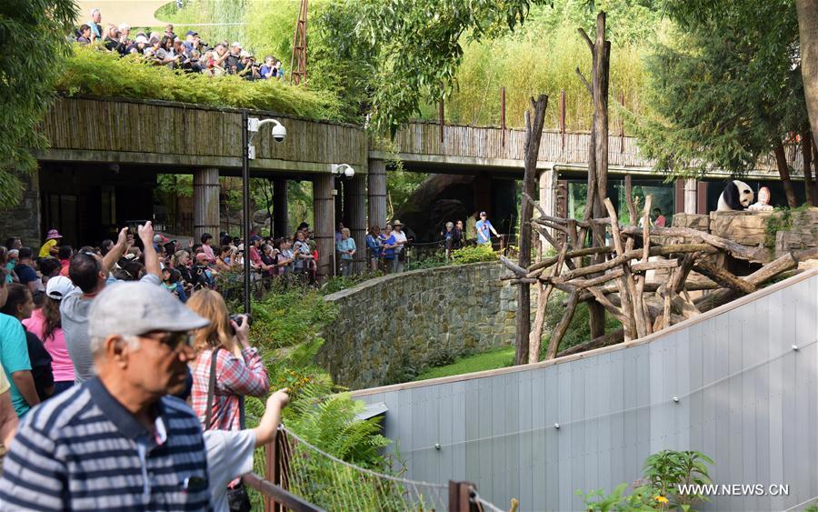 People watch giant panda Tian Tian enjoying birthday cake during a celebration for its 20th birthday at Smithsonian's National Zoo in Washington D.C., the United States, Aug. 27, 2017. The zoo held a celebration on Sunday for giant panda Tian Tian's 20th birthday. (Xinhua/Yin Bogu)